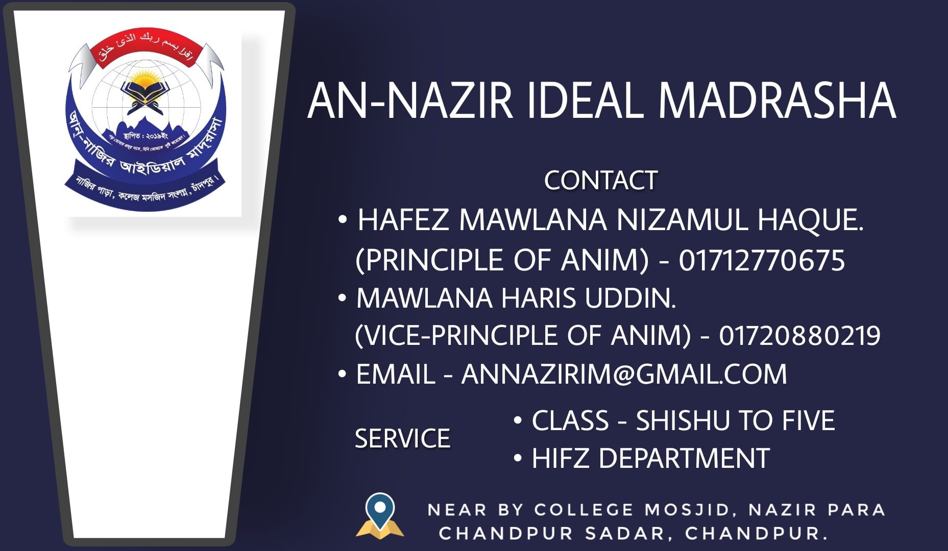 এই মহান উদ্দেশ্য পূরণে ২০১৯ সালে চাঁদপুরের নাজিরপাড়ায় প্রতিষ্ঠিত হয় আমাদের প্রিয় প্রতিষ্ঠান আন-নাজির আইডিয়াল মাদ্রাসা। ভর্তি করার আগে একবার আমাদের মাদ্রাসা ভিজিট করুন। আল্লাহ আমাদের সন্তানদের ইলমে ওহীর আলো দান করুন।
